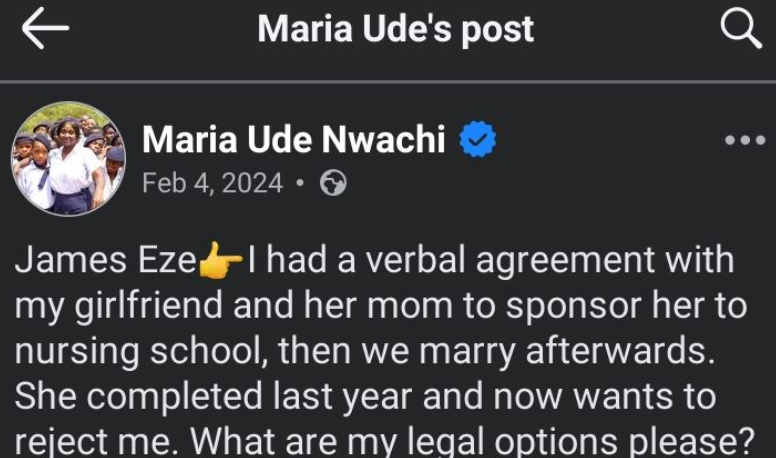 “James Eze👉I had a verbal agreement with my girlfriend and her mom to sponsor her to nursing school, then we marry afterwards. She completed last year and now wants to reject me. What are my legal options please?”.