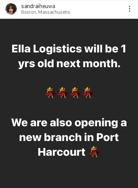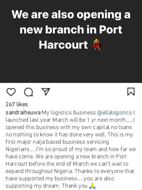 “My logistics business I launched last year March will be 1yr next month…. I opened this business with my own capital no loans no nothing to know it has done very well. This is my first major naija based business servicing Nigerians…..I’m so proud of my team and how far we have come. We are opening a new branch in Port Harcourt before the end of March we can’t wait to expand throughout Nigeria. Thanks to everyone that have supported my business….you are also supporting my dream. Thank you”.
