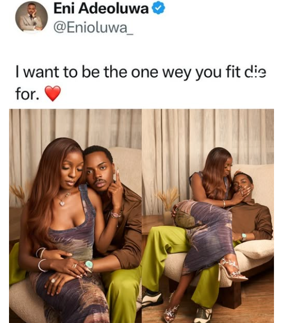 Taking to his social media page, Enioluwa posted the loved-up pictures with a caption that read: “I want to be the one wey you fit die for.”