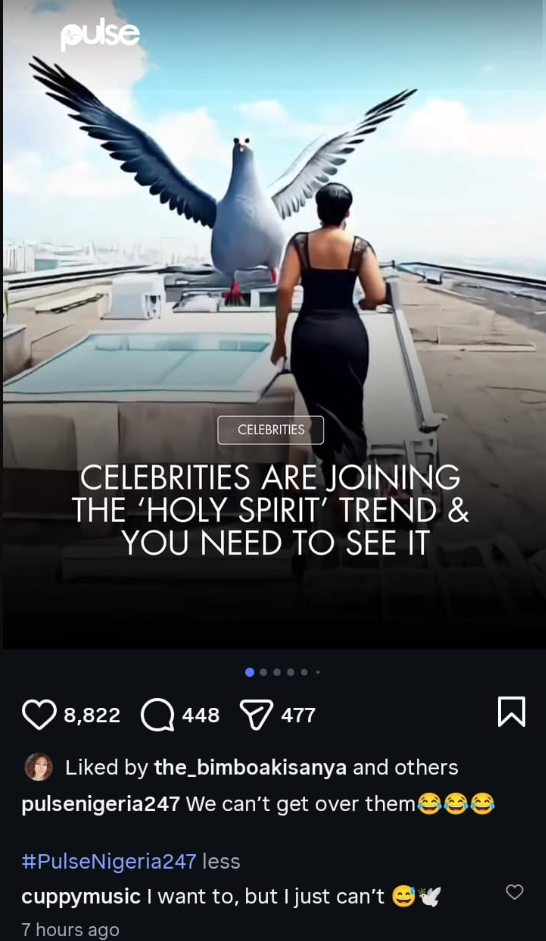Over the past few days, several content creators and celebrities have jumped on the trend, which typically features a person reaching out to the “Holy Spirit,” often represented in bird form. The creative skit format has quickly gained attention across social media platforms.