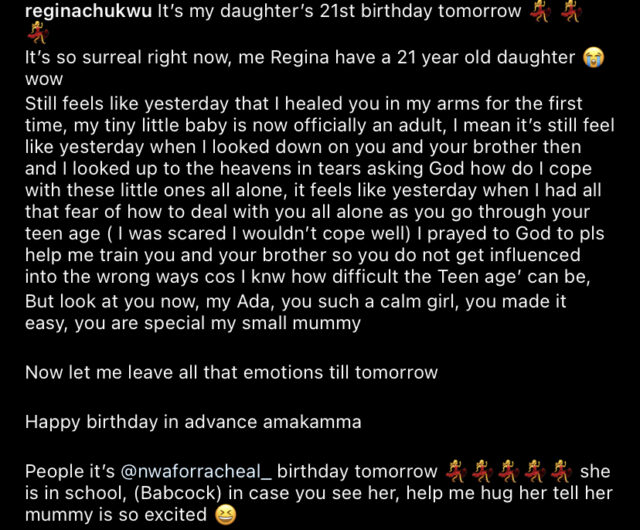 In the lengthy post she just shared on her Instagram page, Regina Chukwu expressed surprise that her daughter is already 21, and it still feels like yesterday when she held her in her hand for the first time.