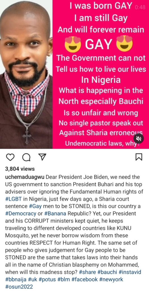 Uche Maduagwu has made a U-turn, claiming again that he is gay. He made this claim while condemning the Sharia court ruling that sentenced a man in Bauchi to death for being gay.