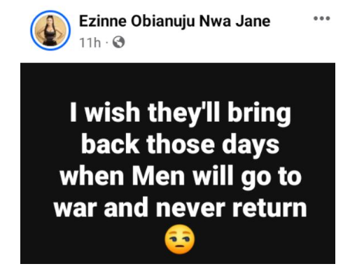 According to her, she longs for those days when men go to war and never return.