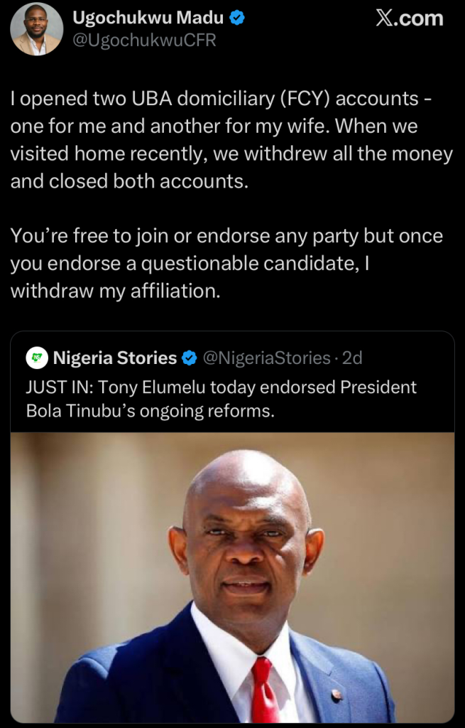 Nigerian-born health communication specialist, Ugochukwu Madu, has reportedly closed all his accounts with United Bank for Africa (UBA) following recent comments by the bank’s chairman, Tony Elumelu, in support of President Bola Ahmed Tinubu’s economic reforms.