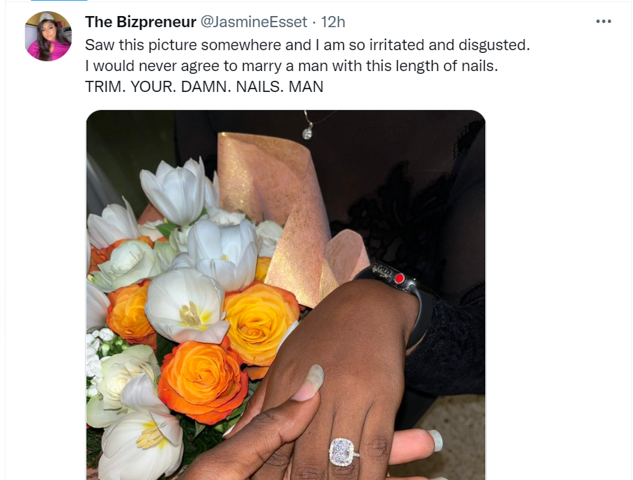The lady identified as @JasmineEsset in a tweet she shared, said she would never agree to marry a man with such length of nails. She further asked men to trim their nails.