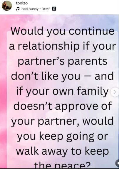 In an Instagram post, Toolz raised a question that many people silently wrestle with: “Would you continue a relationship if your partner’s parents don’t like you? And what if your own family doesn’t approve of your partner?”