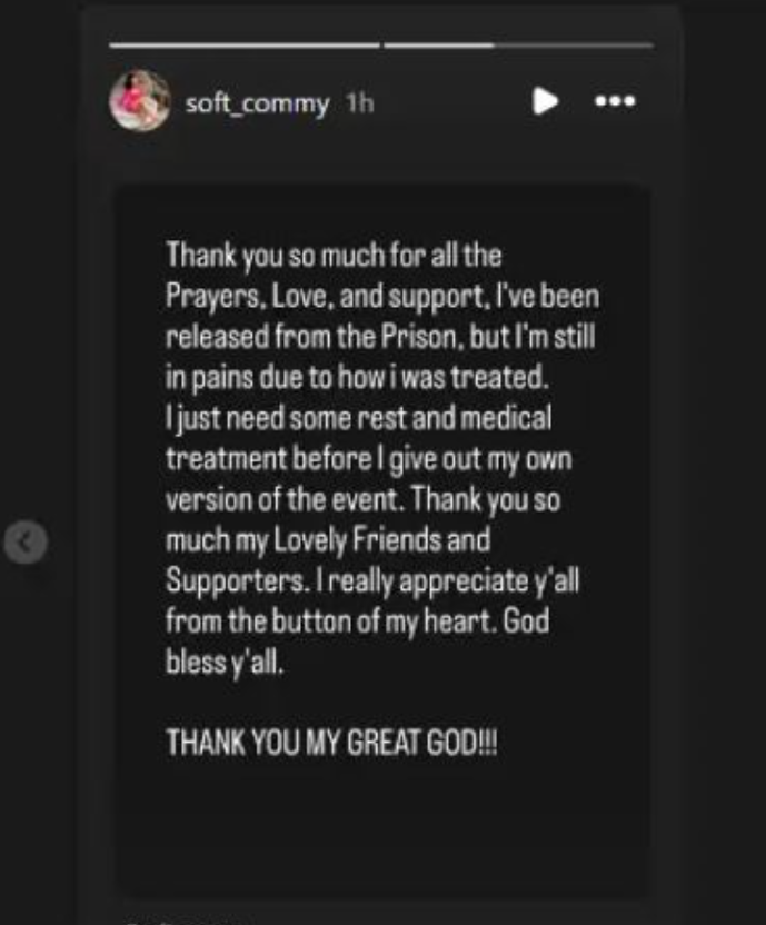 “Thank you so much for all the Prayers, Love, and support, I’ve been released from the Prison, but I’m still in pains due to how I was treated. I just need some rest and medical treatment before I give out my own version of the event.