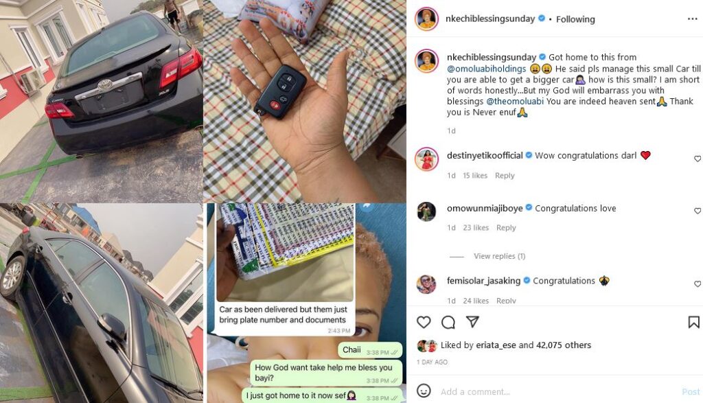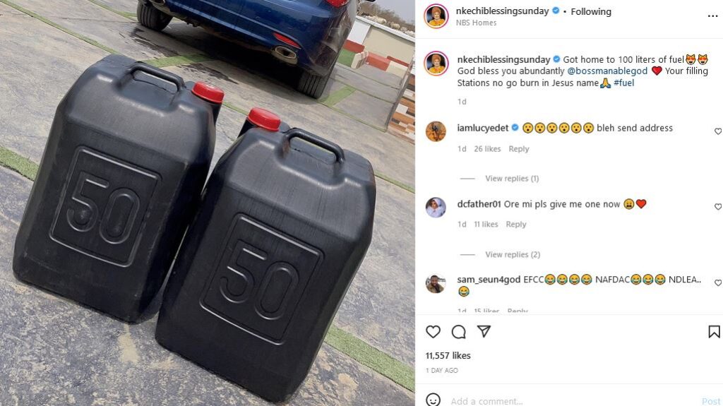 She wrote: “Got home to 100 liters of fuel. God bless you abundantly @bossmanablegod Your filling Stations no go burn in Jesus name #fuel”, NBS wrote.