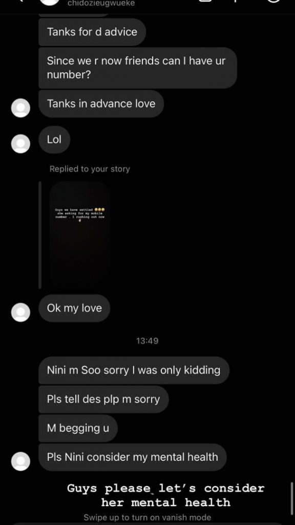 Despite Nini’s tactical response to the troll, she did not stop hauling insults at the reality star whom she referred to as a puppy over closeness with Saga.