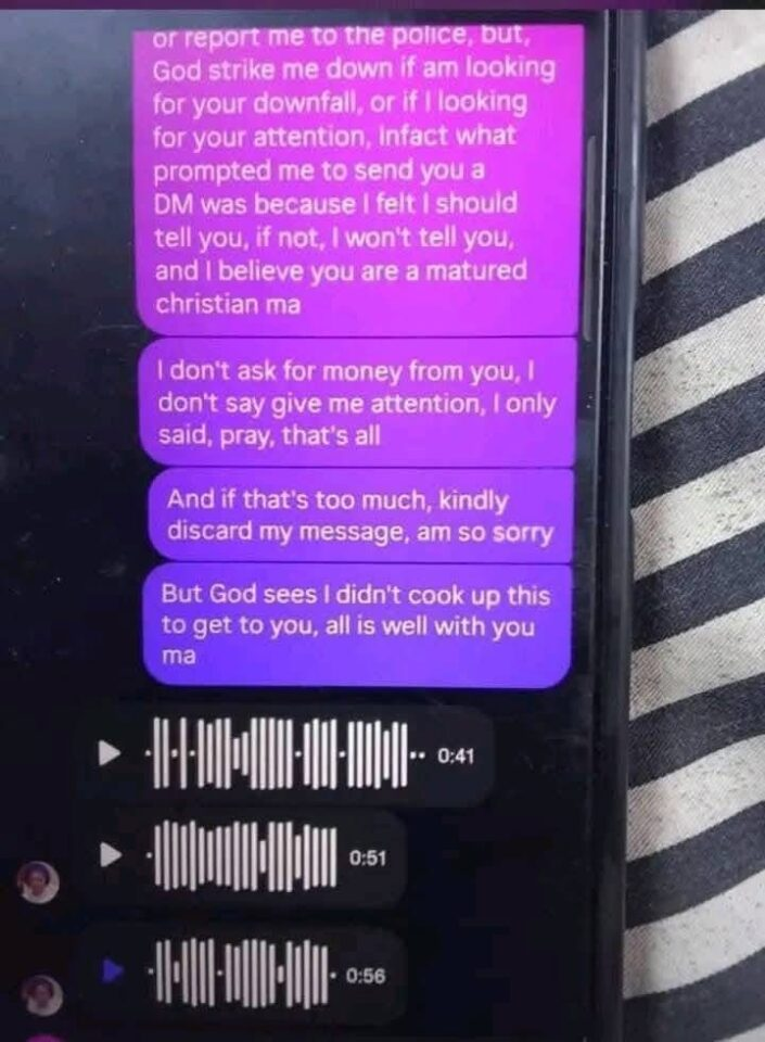 “Hello ma, this might sound absurd, you don’t know me, nor have I also seen you one on one physically before, but I am just a child of God like you. I hope you get to read this message by the mercies of God. I have not come to cook this story and I am not telling you for you to recognise me, but just for you to pray.