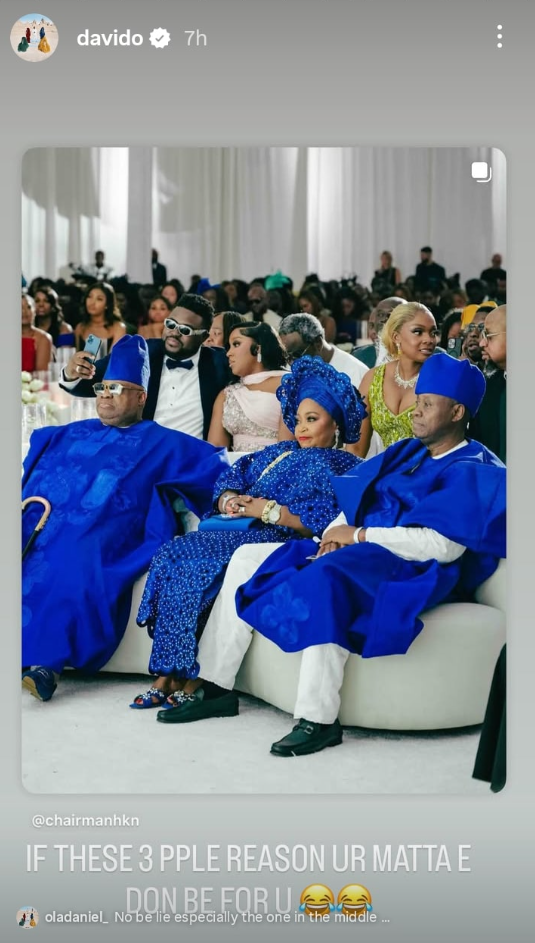 Davido shared a sweet photo of his father Adedeji Adeleke, uncle Governor Ademola Adeleke, and aunt Dupe Adeleke at his Miami white wedding, saying anyone would be lucky if they handled their matters.