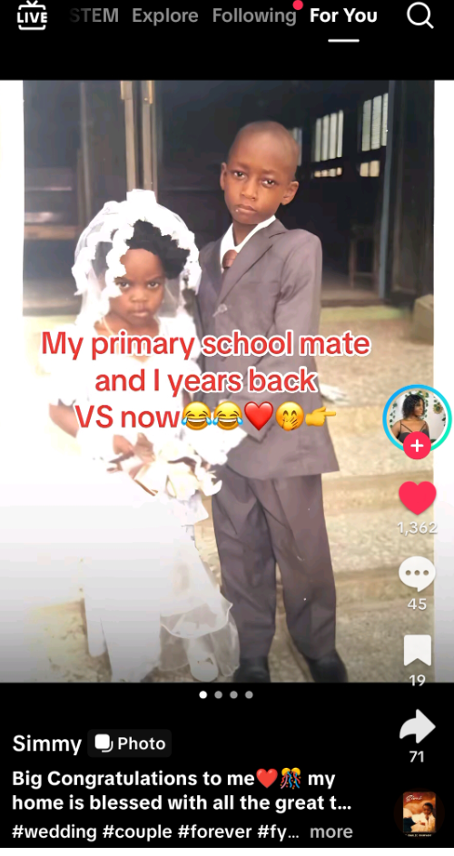 In other news…. A Nigerian woman shared throwback photos on TikTok celebrating her marriage to a primary school classmate, who had once played the groom in a school “wedding” while she was the bride.