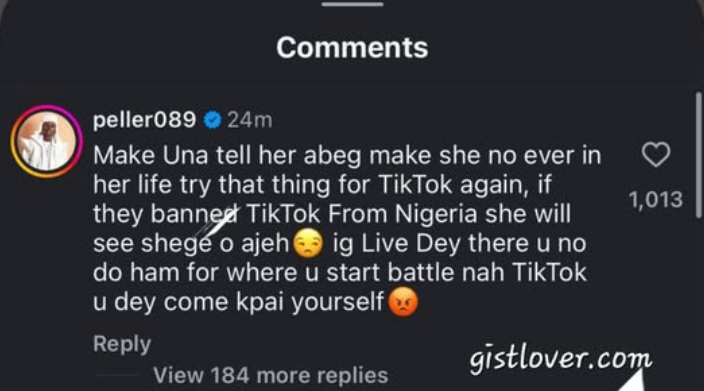 “Make una tell her abeg make she no ever in her life try that thing for TikTok again. If they banned TikTok from Nigeria she will see shege. Instagram Live dey there, you no do am for where you start battle, na TikTok you dey come kpai yourself,” he said.