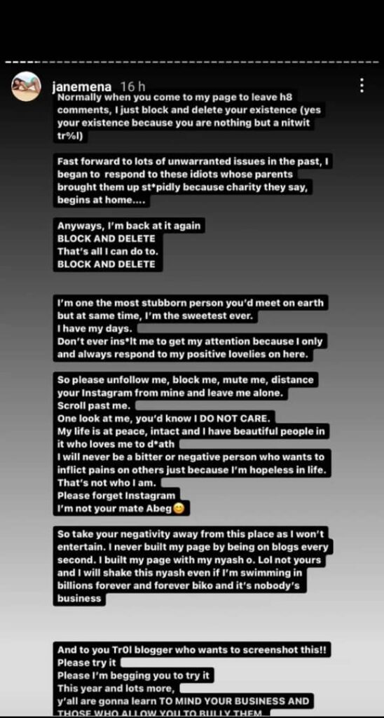 Janemena has issued a warning to social media users who leave hate comments and negative energy on her page.