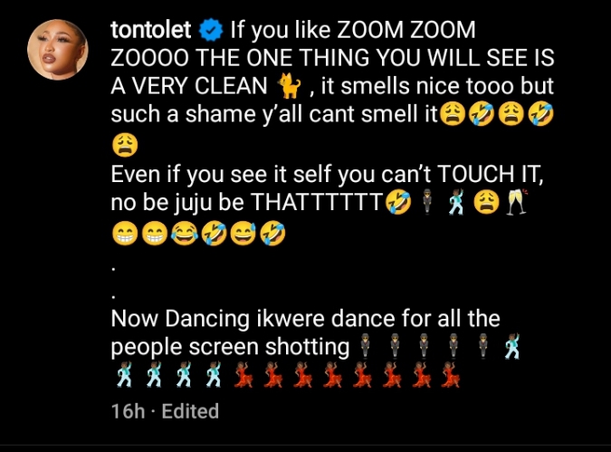 “Now Dancing Ikwere dance for all the people screenshotting.”