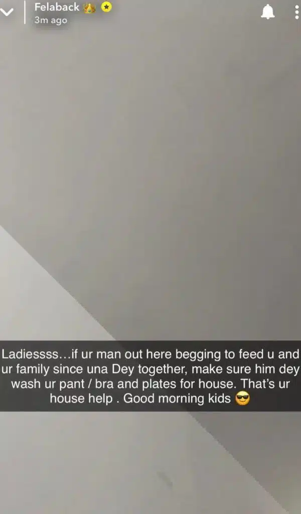 “ladiessss…if ur man out here begging to feed u and ur family since una Dey together, make sure him de wash ur pant / bra and plates for house. That’s ur house help . Good morning kids”, he wrote.