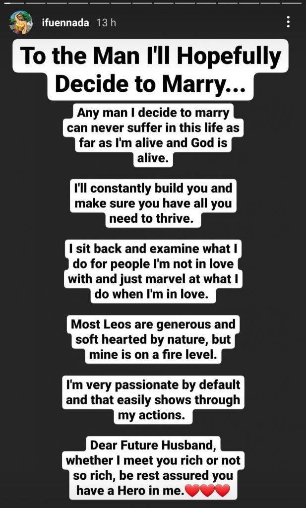 The Nigerian reality star and entrepreneur, Ifu Ennada has wrote an open letter to her future husband assuring him of her support in marriage.