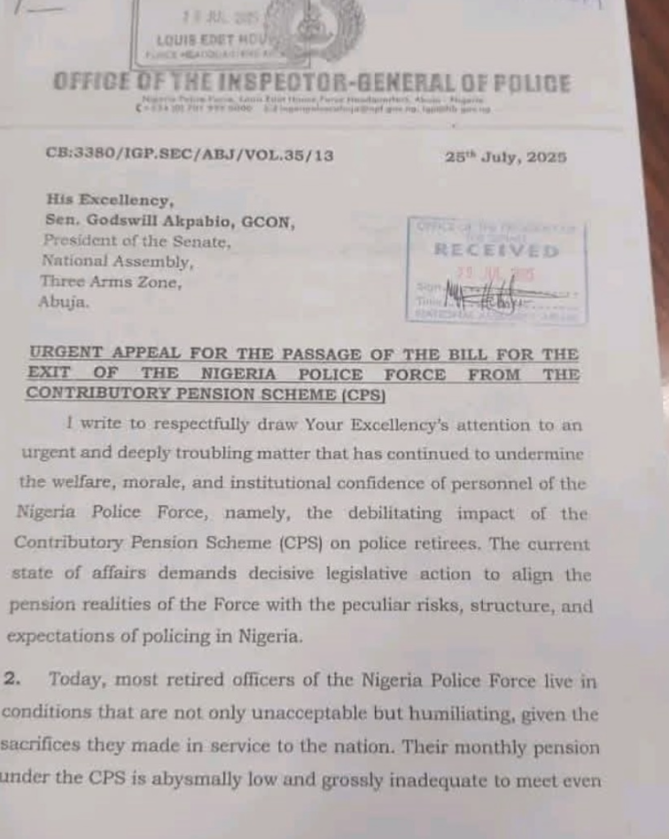 The Inspector-General of Police (IGP), Kayode Egbetokun, has written to Senate President Godswill Akpabio seeking an amendment to the pension law to remove the Nigeria Police Force (NPF) from the Contributory Pension Scheme (CPS).