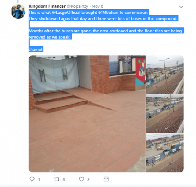 This is what @LasgoOfficial brought @MBuhari to commission. They shutdown Lagos that day and there were lots of buses in this compound. Months after the buses are gone, the area cordoned and the floor tiles are being removed as we speak! Shame!!