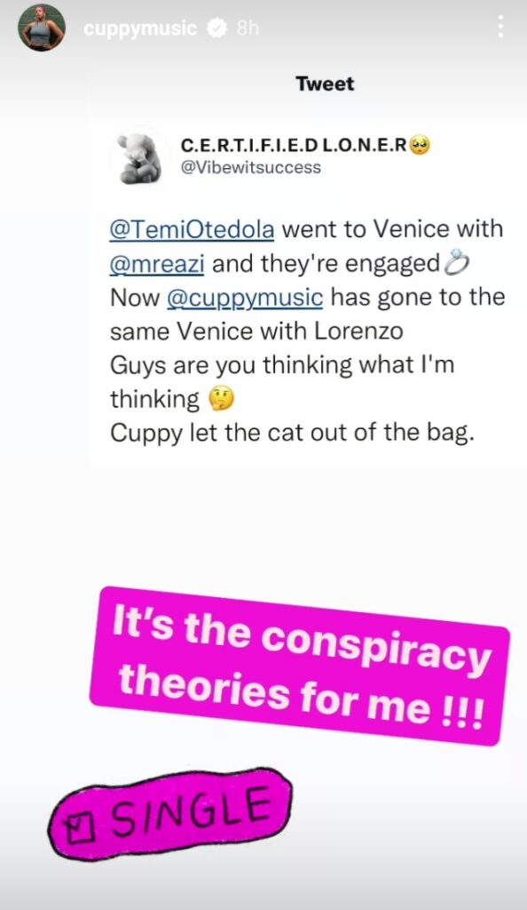 Reacting, Cuppy in her Instagram story post, declared that she is still single and further stressed that Lorenzo is her close friend.