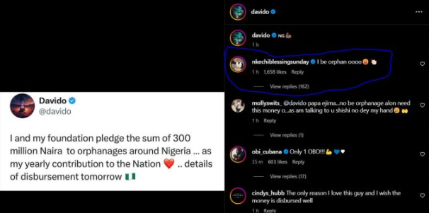 In response, Nkechi Blessing said that she is also an oprhan and, therefore, that she is likewise interested in the money in the comment section of Davido’s post.