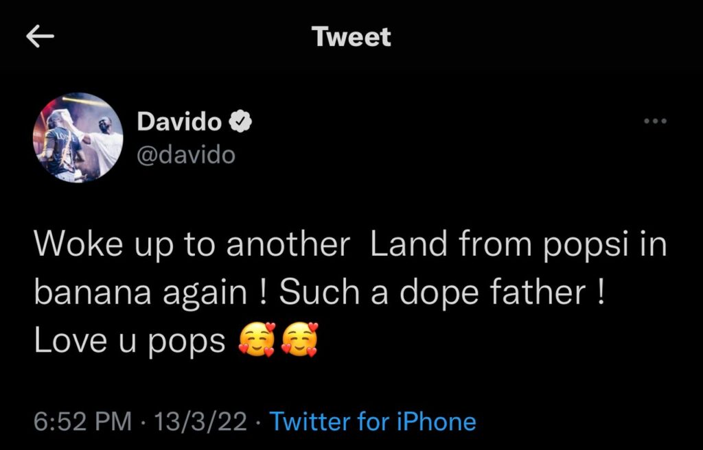 “Woke up to another Land from popsi in banana again ! Such a dope father ! Love u pops 🥰🥰, he wrote.