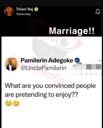 Reality TV personality Tolanibaj has stated that she is certain that individuals pretend to enjoy marriage.