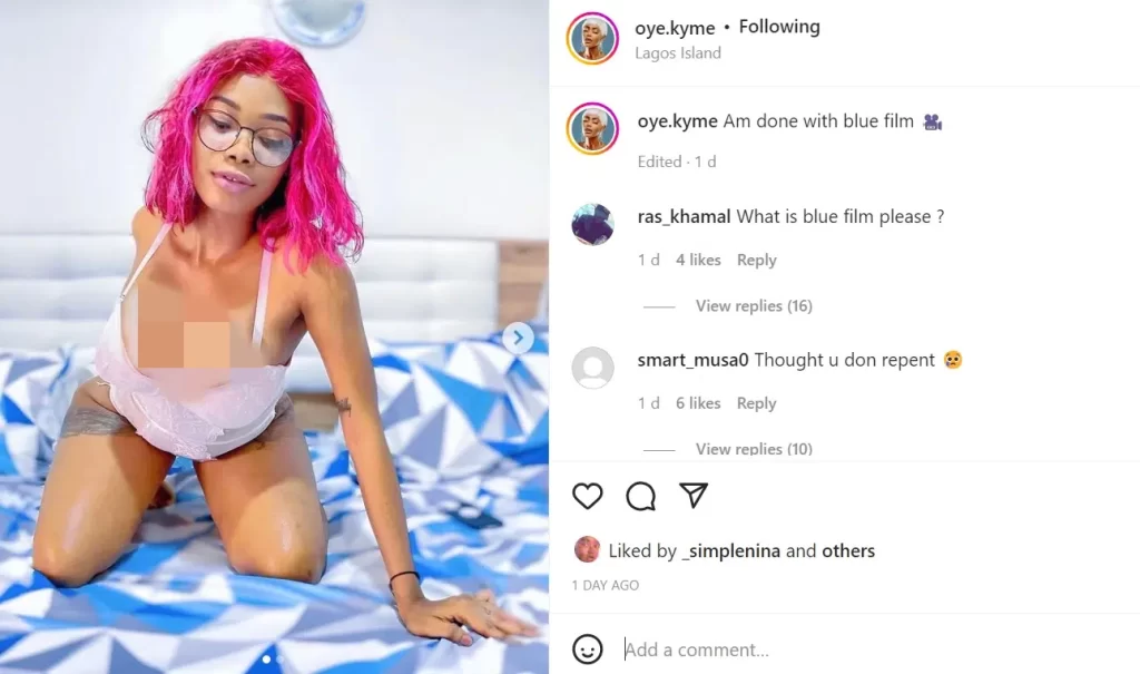 COntroversial crossdresser, Bobrisky’s former personal assistant, Oye Kyme says she is done with blue film.