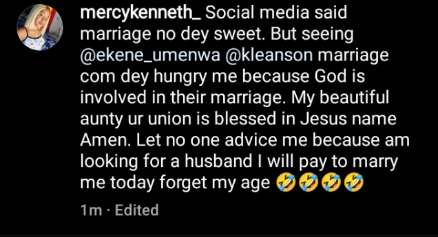 Mercy Kenneth slyly included a note warning anyone against dissuading her from her dreams of marriage, asserting that she’s on the lookout for a husband.