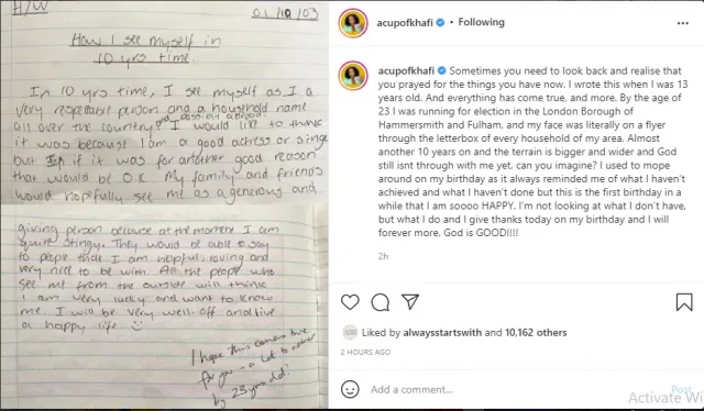 Going down memory lane, she narrated how she documented her life aspirations in the next ten years at the age of thirteen on a sheet of paper and by the age of 23, she had started running for election in the streets of London.