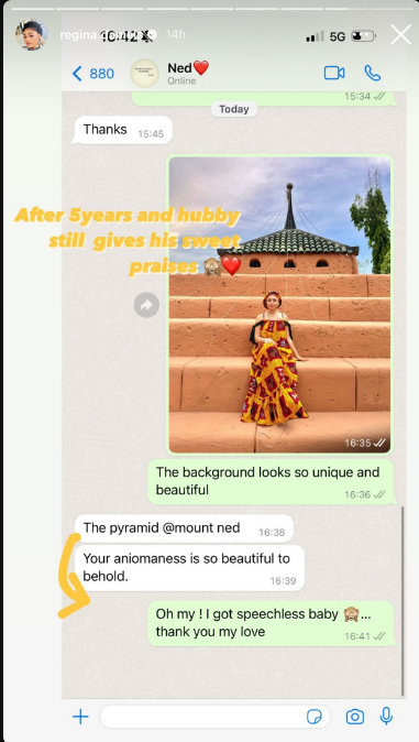 Regina took to Instagram stories to share a snapshot of a WhatsApp conversation she had with Ned in which he complimented her attractiveness in the fresh photographs she uploaded online.