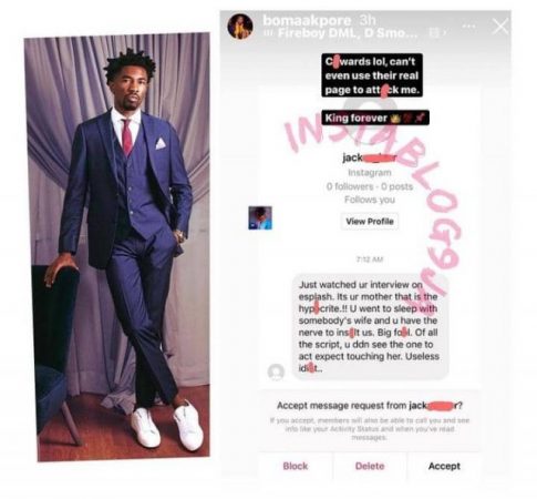 The troll wasn’t pleased with the kind of words Boma used during his interview on Esplash where he apparently called those rebuking him hypocrites insulted him saying his mother is the hypocrite and not them calling him a useless idiot.