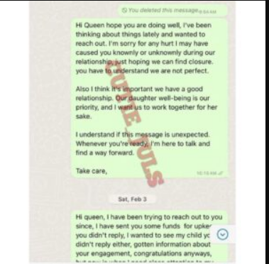 Hi Queen i have been trying to reach out to you, i sent you some funds for upkeep you didnt reply, i wanted to see my child you didnt reply either, got information about your engagememt, congratulations anyways but now is when i need close attention to my child, so your husband to be is not seen as the father, you have to understand am doing all these for the sake of my daughter it is my right, we will have to result in consulting the law for a proper co-parenting of our child. Congratulations once again