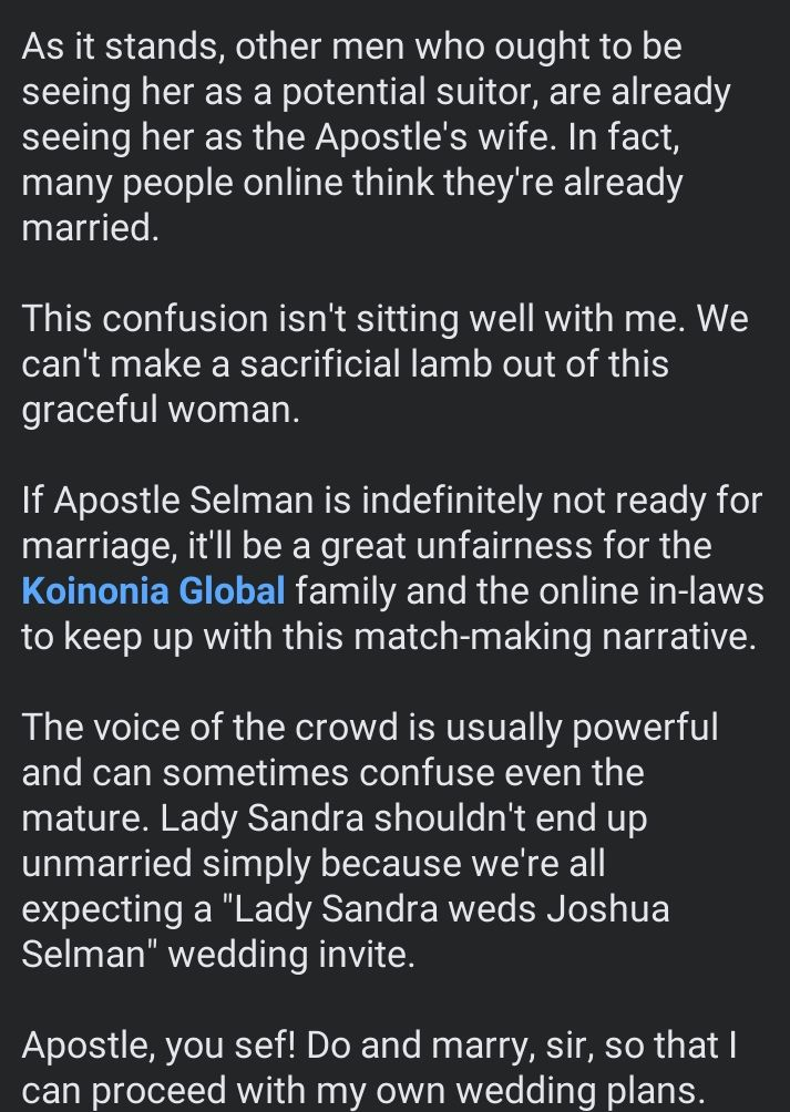 He wrote: “As it stands, other men who might consider her as a potential partner are already seeing her as the Apostle’s wife. Many people online even assume they are married. This confusion is troubling. We shouldn’t let this graceful woman be treated unfairly.”
