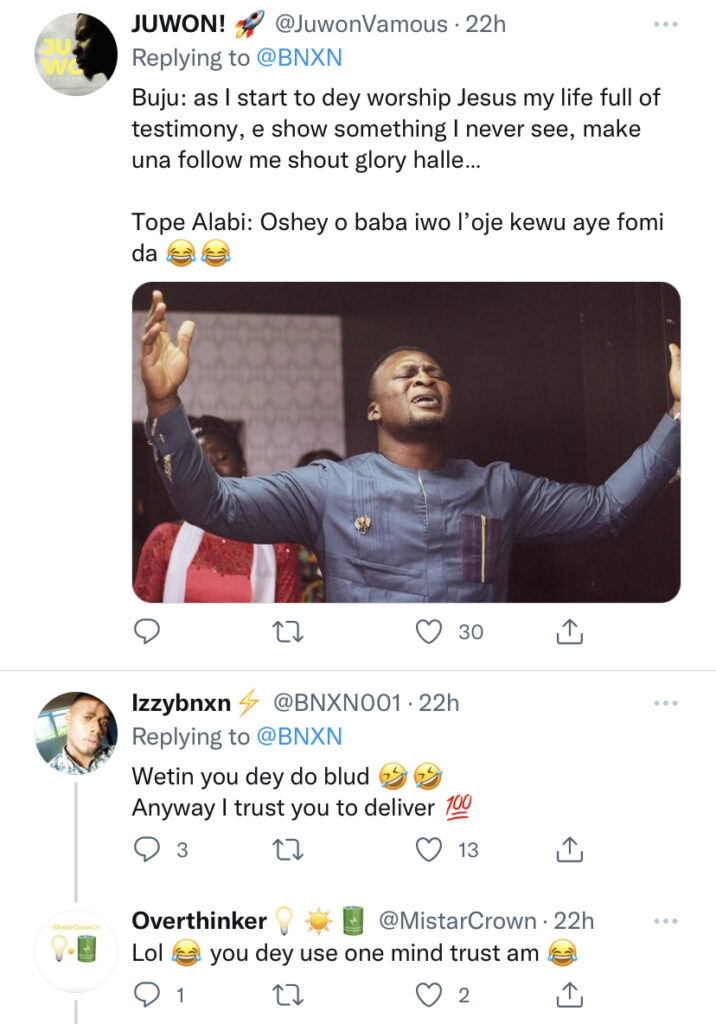 The fan went on to share his post with Tope Alabi, and while Buju awaits her response, he shared the conversation on Twitter with surprise emojis.
