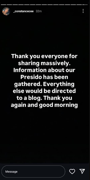 In her IG story, Constance, famous for imitating Speed Darlington in her videos, expressed gratitude to the public for their strong response and help in sharing the news about his disappearance.
