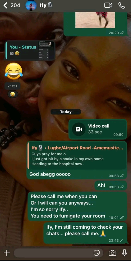 “Please call me when you can or I will call you anyways. I’m so sorry Ify. You need to fumigate your room. Ify, I’m still coming to check chats, please call me.”