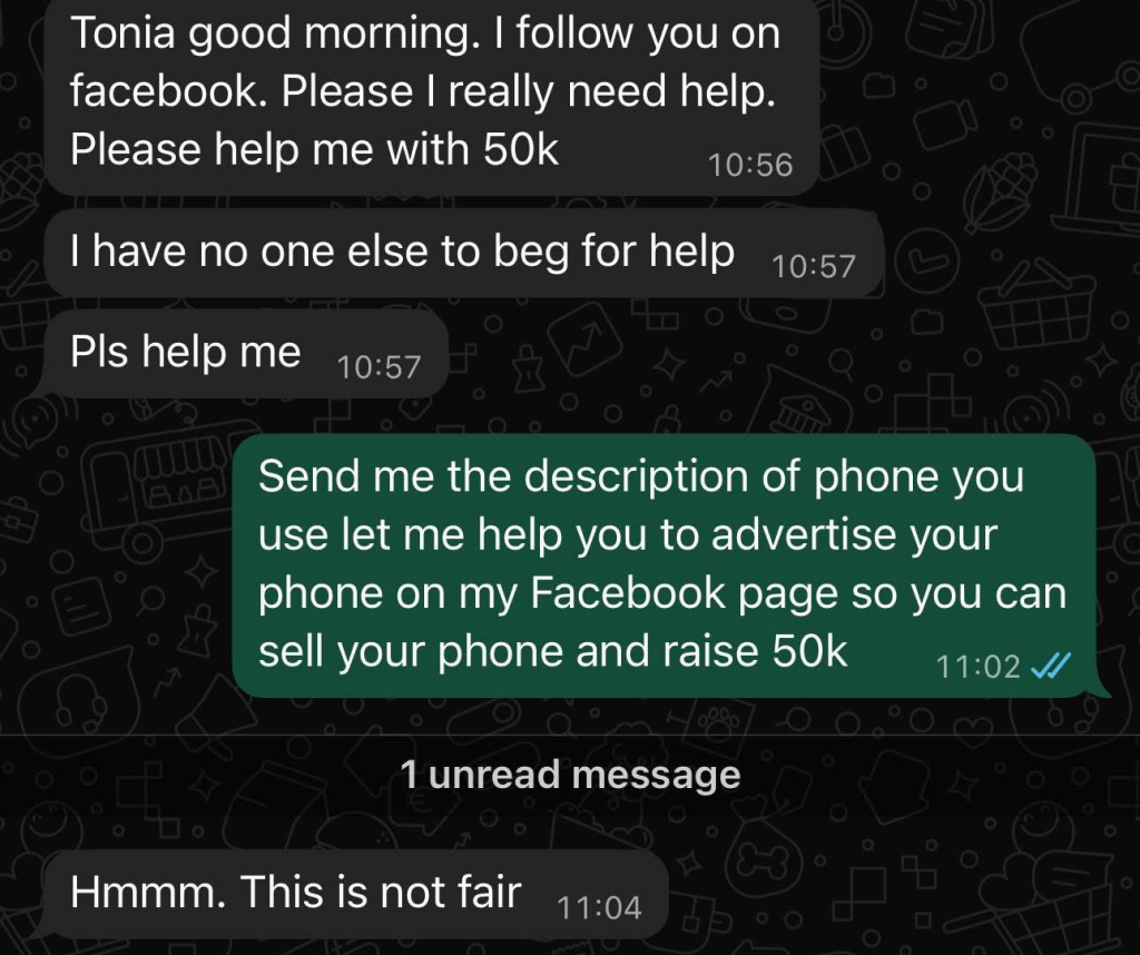 Weeks later, the same woman reportedly called again, giving a long explanation before asking Tonia to lend her ₦50,000. Frustrated, Tonia shared the incident online, highlighting her disappointment and surprise at the request.