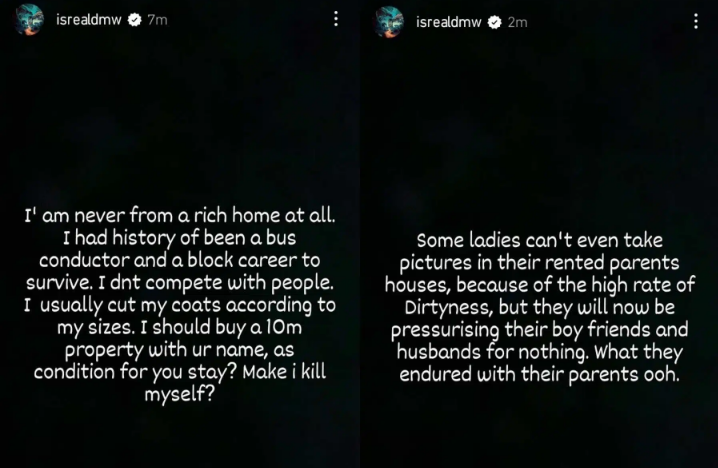 The O2 arena singer disclosed that his wife requested a 10 million home to be registered in her name in order for them to be able to continue living together in a recent Instagram story post.