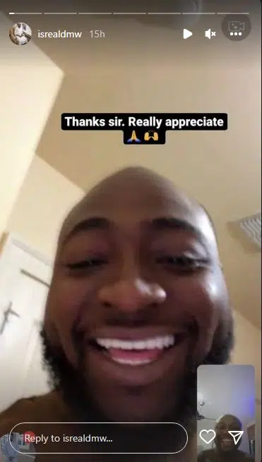 In appreciation, Isreal had a face-time with Davido and shared a photo from their video chat on his Instagram story while thanking the singer for the expensive gift.