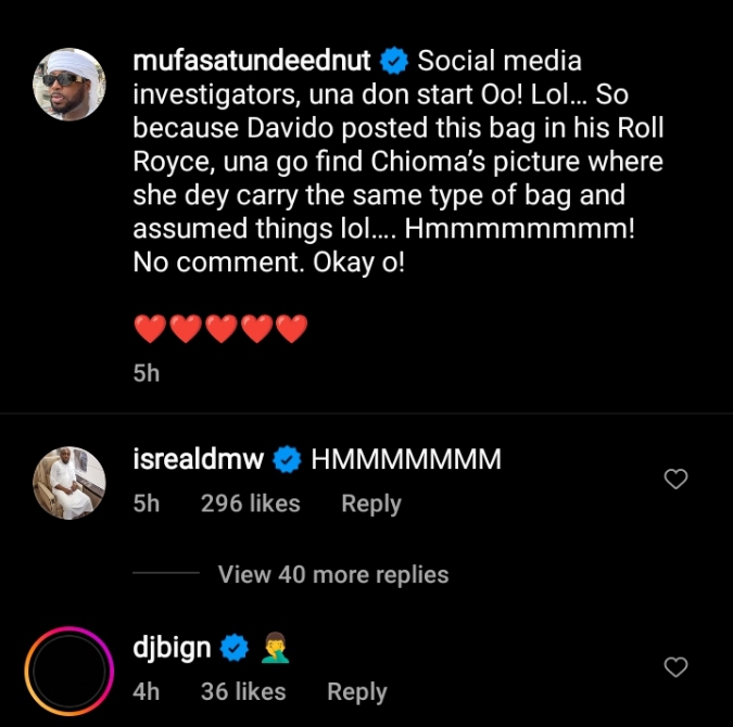 “Social media investigators, una don start Oo! Lol.. So because Davido posted this bag in his Roll Royce, una go find Chioma’s picture where she dey carry the same type of bag and assumed things lol.. Hmmmmmmmm! No comment. Okay o!”
