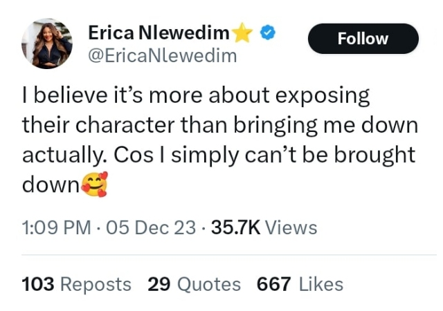 In response, Erica said on the now-famous microblogging site X that she thinks his conduct is more about revealing his character than it is about discrediting him. She let him know through a message that he would never be able to defeat her.
