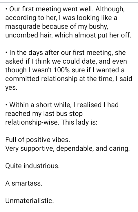 Within a short while, I realised I had reached my last bus stop relationship-wise. This lady is: Full of positive vibes. Very supportive, dependable, and caring. Quite industrious. A smartass. Unmaterialistic. So courageous (cause it takes courage to date a blind man). Has a healthy dose of self-esteem. And a good match for my playful nature.