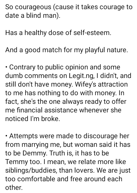 A visually impaired Nigerian man, Demola Adeleke has penned glowing words for his new wife, Temmy.