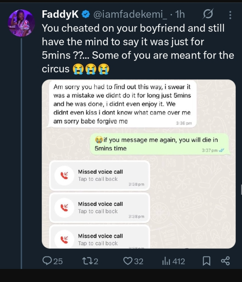 The woman took to X (formerly Twitter) to share a screenshot of a message allegedly sent by a lady who had been caught cheating by her boyfriend. Posting the screenshot, she wrote: “You cheated on your boyfriend and still have the mind to say it was just for 5mins ??… Some of you are meant for the circus.”