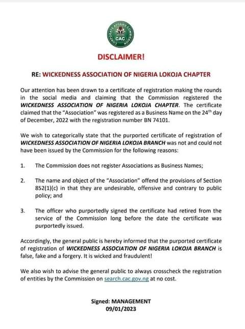 “We wish to categorically state that the purported certificate of registration of ‘wickedness association of Nigeria Lokoja branch’ was not and could not have been issued by the commission for the following reasons: