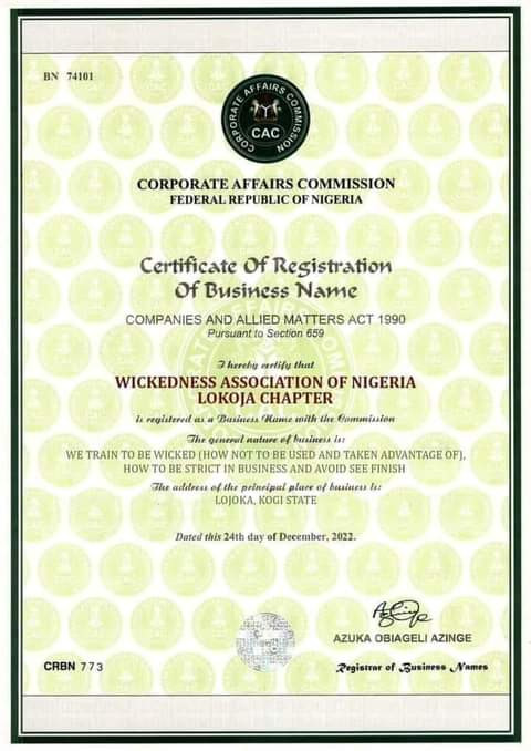 “Our attention has been drawn to a certificate of registration making the rounds in the social media and claiming that the commission registered the Wickedness Association of Nigeria Lokoja Chapter,” the notice reads.