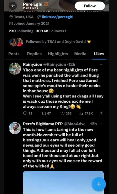 One of Pere’s Twitter followers, Rainyzion, shared that two of her favorite moments during Pere’s time in the house were when he struck the wall during his fight with Doyin and threw the mattress during his dispute with Alex Unusual.