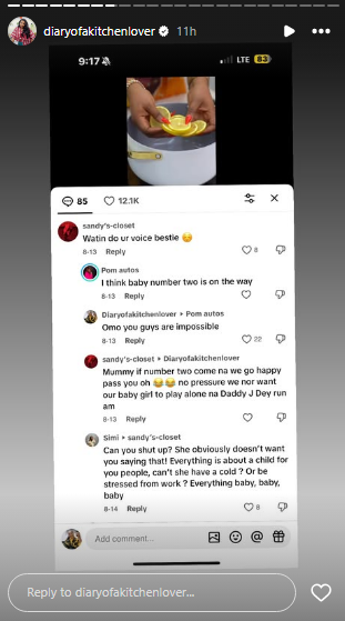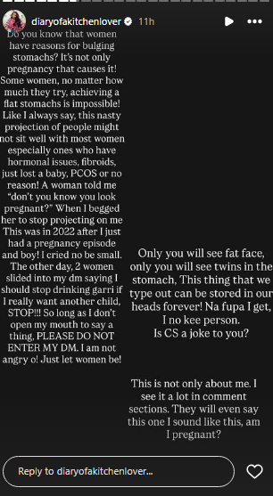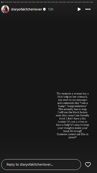 She also addressed unsolicited advice from fans: “Please do not enter my dm. I am not angry o! Just let women be! It’s not a crime to have a bulge. Someone cannot eat eba in peace?”