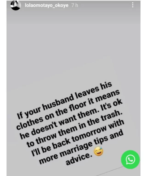 “If your husband leaves his clothes on the floor, it means he doesn’t want them. It’s ok to throw them in the trash. I’ll be back tomorrow with more marriage tips and advice”, she wrote.